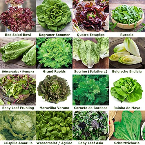 Leveringsomvang: elk 100 sla zaden voor 16 verschillende soorten slaplanten. Elke variëteit is individueel met de hand geplukt en verpakt