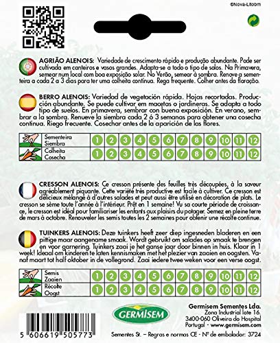 Germisem Alenois Tuin Tuinkers Zaden ontwikkelen zeer diep gesneden bladeren en een pittige aangename smaak. Wordt gebruikt om salades op smaak te brengen en voor garnering. U kunt het hele jaar door tuinkers binnenshuis zaaien. Klaar in 1 week. Ideaal om kinderen kennis te laten maken met de geneugten van zaaien en oogsten. Van maart tot half oktober in de volle grond. Zaaien om de twee weken voor een verse oogst.