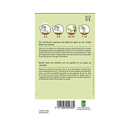Basilicum met bladeren die naar kaneel ruiken en smaken. In een kist of een pot zaaien, die 0-1 cm diep zijn. Kweek ze bij een temperatuur van 20 °C. Vanaf midden mei de zaailingen op een zonnige plaats in de tuin met een afstand van 25 cm planten. Vanaf midden mei kan het zaaien direct in de grond plaatsvinden. Als de winter nadert, houd je de jonge planten in een pot op een vensterbank die goed aan de zon wordt blootgesteld.