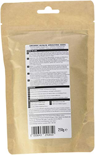 Deze biologische en GM-vrije alfalfazaden zijn ideaal om te ontkiemen. Voor het zaaien grondig in zoet water spoelen en voor het beste resultaat dun zaaien. Gebruik 1,5 eetl. zaden per pot of bak. Houd de temperatuur op 18-22 graden celsius. Geef ze twee keer per dag water. Na 6-8 dagen zijn ze klaar voor consumptie.