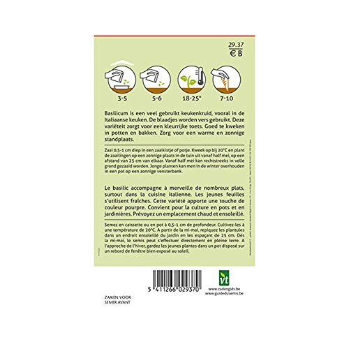 Basilicum is een perfecte metgezel voor vele gerechten, vooral in de Italiaanse keuken. De jonge bladeren worden vers gebruikt. Dit soort brengt een vleugje paarse kleur. Geschikt voor de teelt in potten en plantenbakken. Plan een warme en zonnige locatie. Zaad in een kist of een pot met een diepte van 0,5-1 cm. Kweek ze bij een temperatuur van 20 °C. Vanaf midden mei de zaailingen op een zonnige plaats in de tuin met een afstand van 25 cm planten. Vanaf midden mei kan het zaaien direct op het veld plaatsvinden.